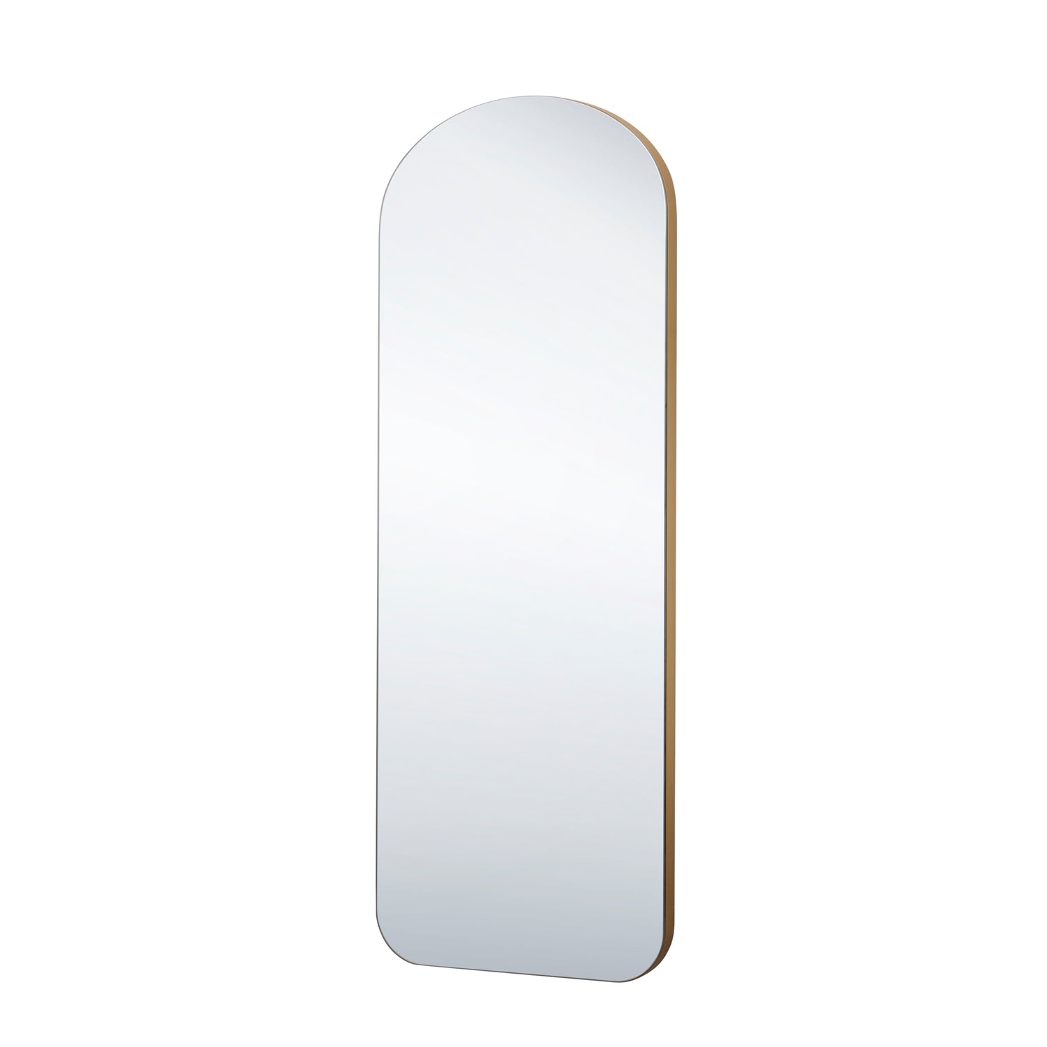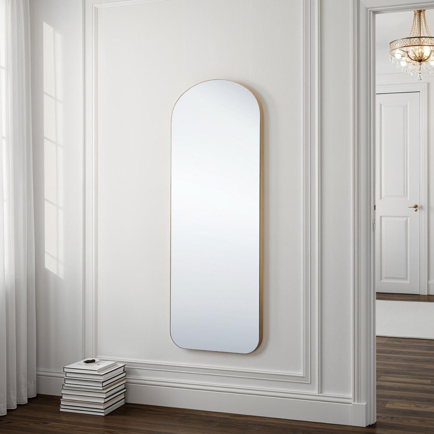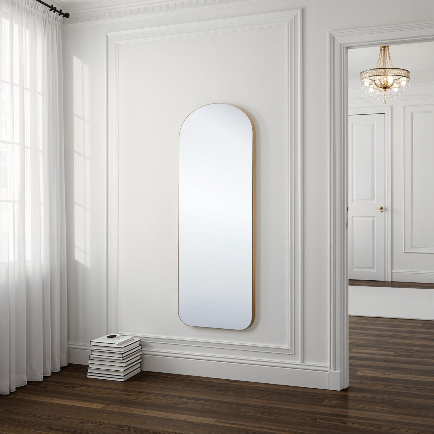 Contemporary tall minimal arched wall mirror with curved corners which enhance the seamless feel. The frame is constructed from wood and finished in a matte gold which can be seen from a side view. The mirror glass has a high quality and crystal clear reflection. Two hanging hooks come attached to the back of the mirror, one at either side to enable vertical wall mounting. Hand made in the UK by skilled artisans.